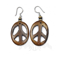 These peace sign earrings are made out of bone. There are three beads attached to the silver hoops. The bone color shading may differ from the exact picture on each pair from a cream color to a brown. No two alike.