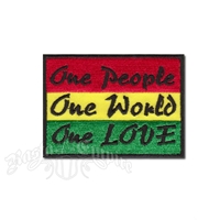 This stitched patch features the black printed words "One People One World One Love" with a black border. The background is striped in the rasta colors of red, gold and green. Approximate size is 4" x 3".