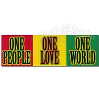 This sticker features One People, One Love and One World. Each block is colored in the rasta colors of red, gold and green with black added in the block letters.