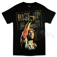 This black tee showcases Bob Marley with his arm up. Printed on the shirt is Rise UP Bob Marley. The Conquering Lion of Judah is also pictured. The shirt has a light effect look.
