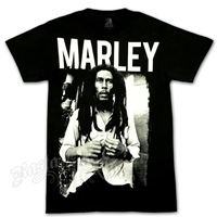This core Bob Marley tee features Bob Marley in long dreads. Marley is printed on the top in bold white letters. This tee is all black and white print.