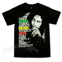 This black core Bob Marley tee features Bob Marley and the lyrics from Trenchtown Rocks. Bob Marley is pictured in his legend pose with his ring. The printed lyrics: One Good Thing About Music, When It Hits, You Feel No Pain, Bob Marley. The rasta colors are present in the lyrics.