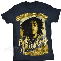 This indigo colored tee features Bob Marley Buffalo Soldier. Printed on the t-shirt: Buffalo Soldier, Fighting on Arrival for Survival and in script is Bob Marley.
