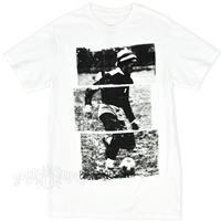 This white core Bob Marley tee showcases Bob Marley playing soccer. In Jamaica they call this football. The image of Bob Marley is split with lines. Bob Marley 77 is printed on the bottom.