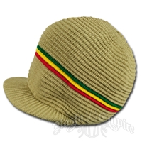 This khaki cotton cap with visor has a has the rasta stripes around and a ribbed texture.