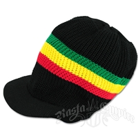 This rasta cap with visor is black with rasta stripes around the center. The brim is made of cotton. One size fits most.