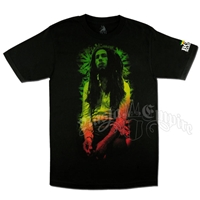 This black Bob Marley tee shows a rasta colored image of Bob Marley with marijuana leaves in the background. Printed on the sleeve is the Bob Marley logo.