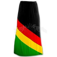 This skirt is black with diagonal rasta stripes at the bottom. The skirt has an elastic waist band. Hand wash and hang dry. Made of 95% Rayon and 5% Spandex.