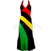 This long halter dress has rasta stripes with black along the front. The dress has a red stripe on the bust. The back of the dress is all black. Hand wash and hang dry. Made of 95% Rayon and 5% Spandex.