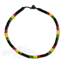 This rasta necklace has coco beads in red, gold, green and black with a button slip knot closure.