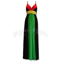 This long v-neck rasta and reggae dress has spaghetti straps and soft padded cups. The bust is striped red and black with a yellow waistband and has a wide green stripe that runs down the center. The back of the dress is solid black.