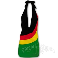 This mini-dress has a draped adjustable tie back neckline and features a diagonal pattern with red, yellow and green. The bottom portion has elastic gathered seams on both sides. The back is solid black. Made of 95% rayon and 5% spandex.
