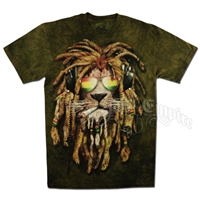 This olive green tie dye tee features a Rasta lion smoking. The lion has rasta color beaded dreads, headphones and rasta colored sunglasses.