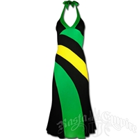 This long black halter dress has green and yellow colored Jamaican stripes twisting across it diagonally. The top of the dress has a green neck tie and a green stripe across the bust. A yellow stripe crosses the middle and a wide green stripe adorns the bottom. The back of the dress is all black and comes up to the wearer's shoulder blades.