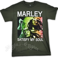 This olive green tee features two boxed images of Bob performing. The images are done in a Rasta colored fade. "MARLEY" and "SATISFY MY SOUL" are printed in white.