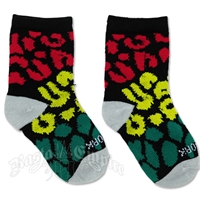 These infant black socks feature Rasta colored leopard pattern stripes printed allover. They also have contrasting grey heel and toes to add an extra splash of color. The socks are made of 87% cotton, 10% nylon and 3% spandex.