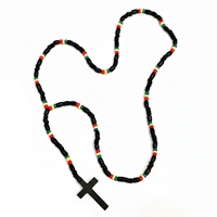 This Rosary style wood beaded necklace features a black wooden cross with Rasta colored wood beads.