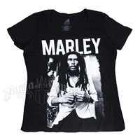This black, 100% cotton tee features a black and white image of Bob Marley and the word “MARLEY” in large, shite font above it. This is a plus size only shirt.