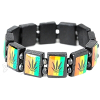 This bracelet is made of black, rectangular wooden beads separated by two small, round beads. Each rectangle features a black marijuana leaf against a green, gold, and red Rasta stripe background.