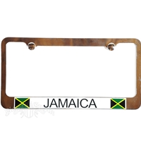 A shiny chrome standard-sized license plate frame with the word “JAMAICA” between two small images of the Jamaican flag. A white border makes the design easier to see.