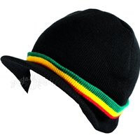 This black cap has both a cuff and a visor and features a Rasta-striped trim.