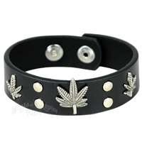 This black leather cuff bracelet is decorated with metal accents, including three marijuana leaves – two smaller ones on either side of a larger leaf in the center.