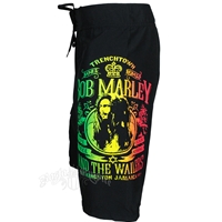 These black board shorts feature a Bob Marley and the Wailers seal design in fading green, yellow, and gold. The design prominently displays several Rasta and reggae references, including a Lion of Judah on either side of Bob Marley’s portrait. “Trenchtown” arcs over the top of the design, just above a crown centered between the words SOUL and REBEL. Two ribbons display a motto: Live Free, and Fear Nothing.