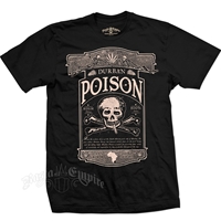 The Seven Leaf Original design on this black t-shirt is reminiscent of an old, weathered bottle of poison. A skull and crossbones with a joint between its teeth is in the center of the design while two smoking skeletons lounge along the top. Information on the cannabis strain is written in script font beneath the skull and crossbones and at the very bottom is a small map of Africa, with the port city of Durban marked with a star.