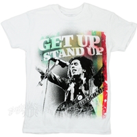 This white tee features a black and white image of Bob Marley in concert, with a microphone in front of him and a guitar slung over his shoulders. Both arms are outstretched, with the text above Marley reading “Get Up, Stand Up” in negative against green, yellow, and gold color. The design on the shirt is made to look like spray paint and is faux-distressed.