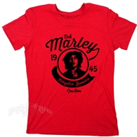 This heather red t-shirt features a simple all-black design of Bob Marley within a circle. Above Marley’s image is his name in a script font and below it is a black ribbon containing the words “Kingston Jamaica.” At the very bottom of the design is “One love” and it also features the year 1945, for Bob Marley’s birth year.