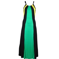 This long maxi dress is made of a large center panel of green and thinner stripes of yellow on either side. It has a drawstring neck and a racerback style back.