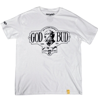 This white 100% super soft cotton slim fitted features one of Ross' Golds Platinum strains BC God Bud. God Bud is written large in black on either side of an iconic male Greek God and his hands with a spliff. Below the main image is the 23% THC level and the words A High from on High with a small Ross' Gold emblem all encased in a movie ticket type border. The tee is adorned with a Ross' Gold sewn on tag at the bottom left of the shirt along with a Ross' Gold sleeve print on the right arm.