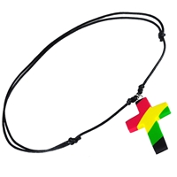 This adjustable black cord necklace features a Rasta inspired cross charm as the traditional Red, Yellow and Green are diagonally striped. Jah Bless