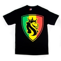 This black t-shirt features a rasta green, yellow, and red colored shield with a crowned lion in the center. The back also features the same design, but scaled smaller on the upper back area. 100% cotton.
