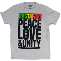This heather grey cotton t-shirt features "RASTAFARI" in a red, yellow, and red gradient at the top, with the phrase "PEACE LOVE & UNITY" in black below. The letters have a slight distressed look, along with 3 rasta colored stars in the middle of the letter 'O'.