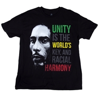 This black t-shirt is printed with an airbrush-style black and white portrait of Bob Marley and the words "Unity is the world's key, and racial harmony" in a faux-distressed font alternating between green, yellow, red, and grey.
