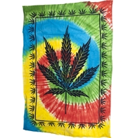 This tapestry features a marijuana leaf with a tie dye design in the background. The tapestry has weed leaves around the boarder. Made of 100% cotton. This twin size tapestry is approximately 54” x 86”. All tie dyes have their own unique appearance and each may be a little different than what is pictured.
