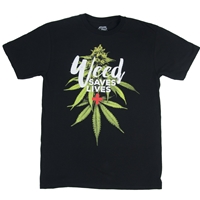 This black t-shirt features “Weed Saves Lives” in white with the medical red cross below. A marijuana plant is pictured in the background. Made of 100% cotton. This is an original Seven Leaf design.