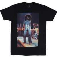 This black t-shirt features an image of Bob Marley on stage with his arms crossed swaying to the beat. Marley is printed across the image. Made of 100% cotton.