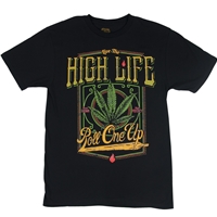This marijuana t-shirt is black with a High Life design in Rasta colors. The shirt has “Live The High Life” and “Roll One Up” with a green weed leaf and a yellow joint. “Home Grown” and “High Potency” are printed next to the weed leaf. This is an original Seven Leaf design. Made of 100% cotton.