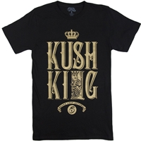 Are you a Kush King? This Seven Leaf Apparel original design features KUSH KING in bold type with metallic gold ink on a men's black tee. Inside the "N" is an illustration of the classic playing-card King holding a bong rather than his traditional sword.