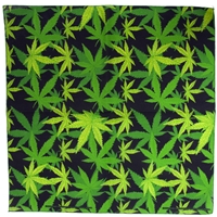 This 22" x 22" black bandana features an all-over pattern print of marijuana leaves in various shades of green.