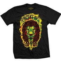 This black t-shirt features a dreadlocked Rasta Lion of Judah. The Rasta lion is framed in a splattering of Green, Gold, and Red paint with Rastafari knocked out at the top of the design. This is an original RastaEmpire design. Made of 100% cotton.