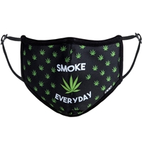 It's 4:20 Somewhere! This black, unisex, one-size-fits-most, washable face mask, features a pattern of green cannabis leaves with the words Smoke Everyday printed across the front.