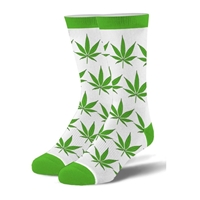 These white and green men's crew socks feature green cannabis leaves printed across.