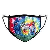 This face mask features images of iconic stoners Cheech and Chong in front of a classic tie dye pattern with illustrated weed leaves in the foreground.