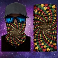 This 1 size fits most, Gaiter face sleeve features a spiraling Rasta green, gold, red weed leaf pattern on a black back ground.