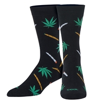 These black men's crew socks feature green cannabis leaves, joints, and blunts.