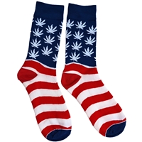 These red, white, and blue men's crew socks feature white weed leaves as 'stars' for a play on the American flag.