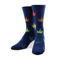 These navy blue men's crew socks feature a pattern of rainbow cannabis leaves across the entire sock.